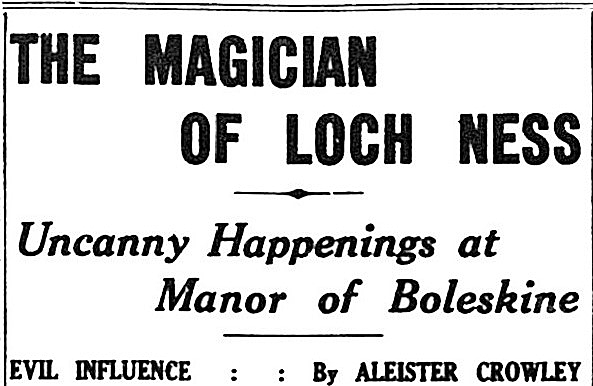 • Headlines of article by Aleister Crowley that appeared in the Empire News, Sunday, November 12, 1933 E.V. In November 1933 E.V. Crowley wrote a nearly 1500-word piece for the Manchester Sunday paper Empire News headed “The Magician of Loch Ness – Uncanny Happenings at Manor of Boleskine – Evil Influence”. Rose had died the year before the article appeared, on February 11, 1932 E.V. (An Iv; Year 27 in the Aeon of Hoor.)