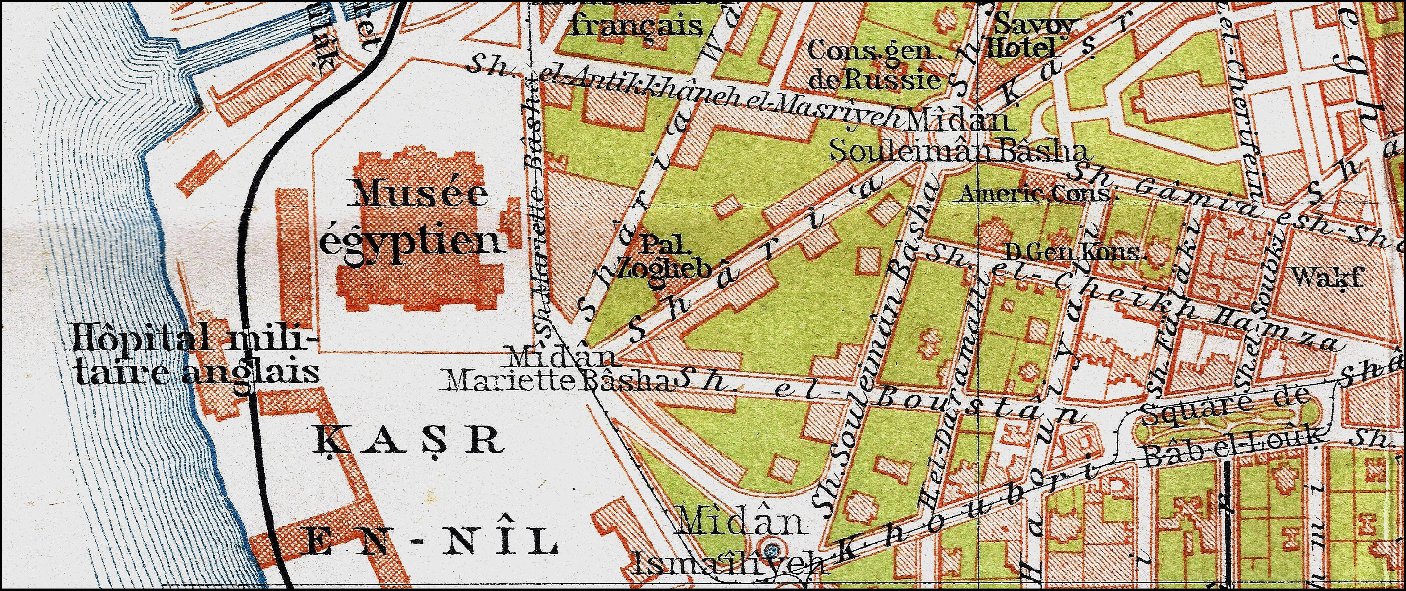 Map showing the Cairo Museum at Kasr en-Nîl, together with Midan Soliman Pasha ('Souleimân Bâsha') with the Standard Life Insurance Building, c. 1906-7 E.V. - Author's collection