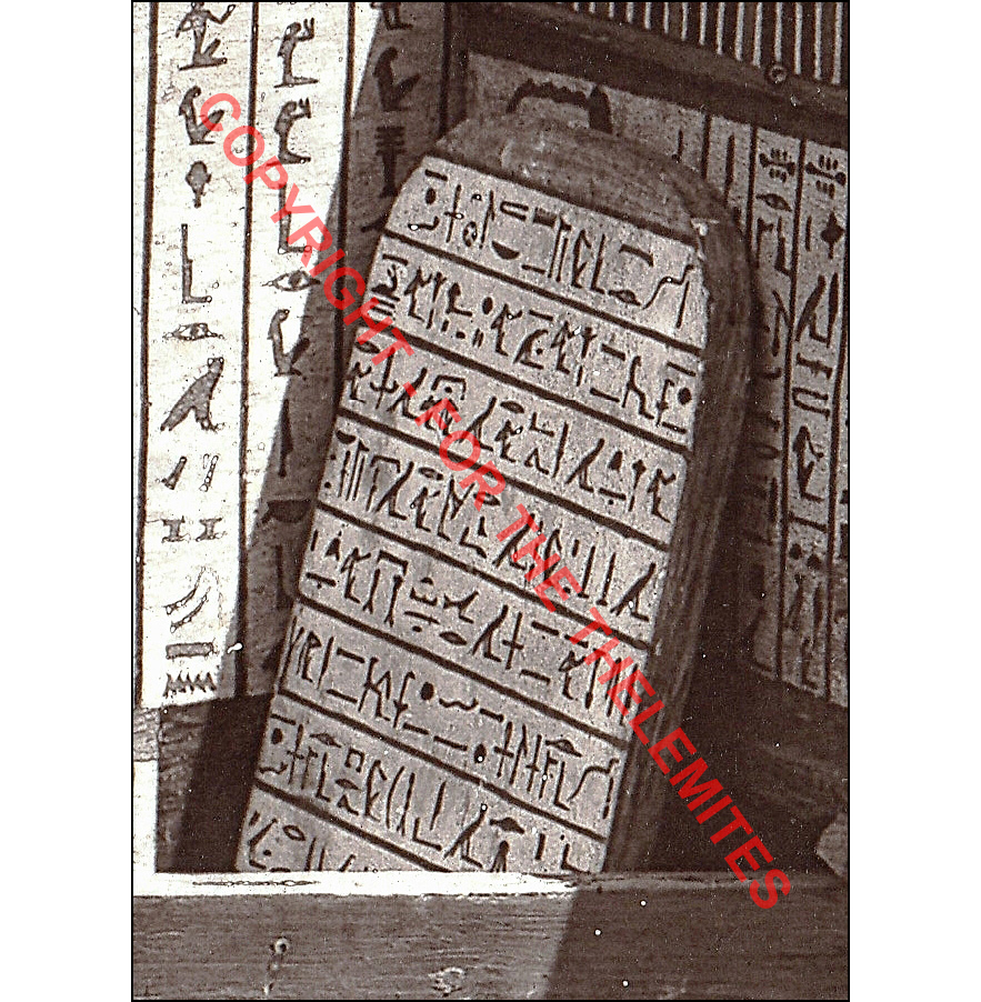 The reverse of the funeral stele of Ankh-af-na-khonsu from Planche 15 in Album du Musée de Boulaq, publish by Auguste Mariette in 1872. The first half of the eleven horizontal lines of inscription on the reverse of the stele contains the first part of a version of Chapter 30 (or Spell 30) of Book of Going Forth by Day - also known as Book of the Dead - and the second half of the inscription is Chapter 2 of the same book. Chapter 30 is a chapter usually engraved upon funeral scarabs and very unusual to find upon a funeral stele. However, the first part of the chapter is also engraved upon Ankh-af-na-khonsu's inner coffin, known as 'the egg', and a larger portion of the chapter on his great sarcophagus. Chapter 30 is in Book of Going Forth by Day entitled: "Chapter of not letting the heart of a man be driven away from him in the underworld", and Chaper 2: "Chapter of coming forth by day and living after death" - the latter a most splendid chapter, which, as we know now, revealed the coming of Perdurabo - TO MEGA THERION - in order to 'do his will all upon earth among the living', proclaiming the Aeon of Horus, and the Law of Thelema! Author's collection.