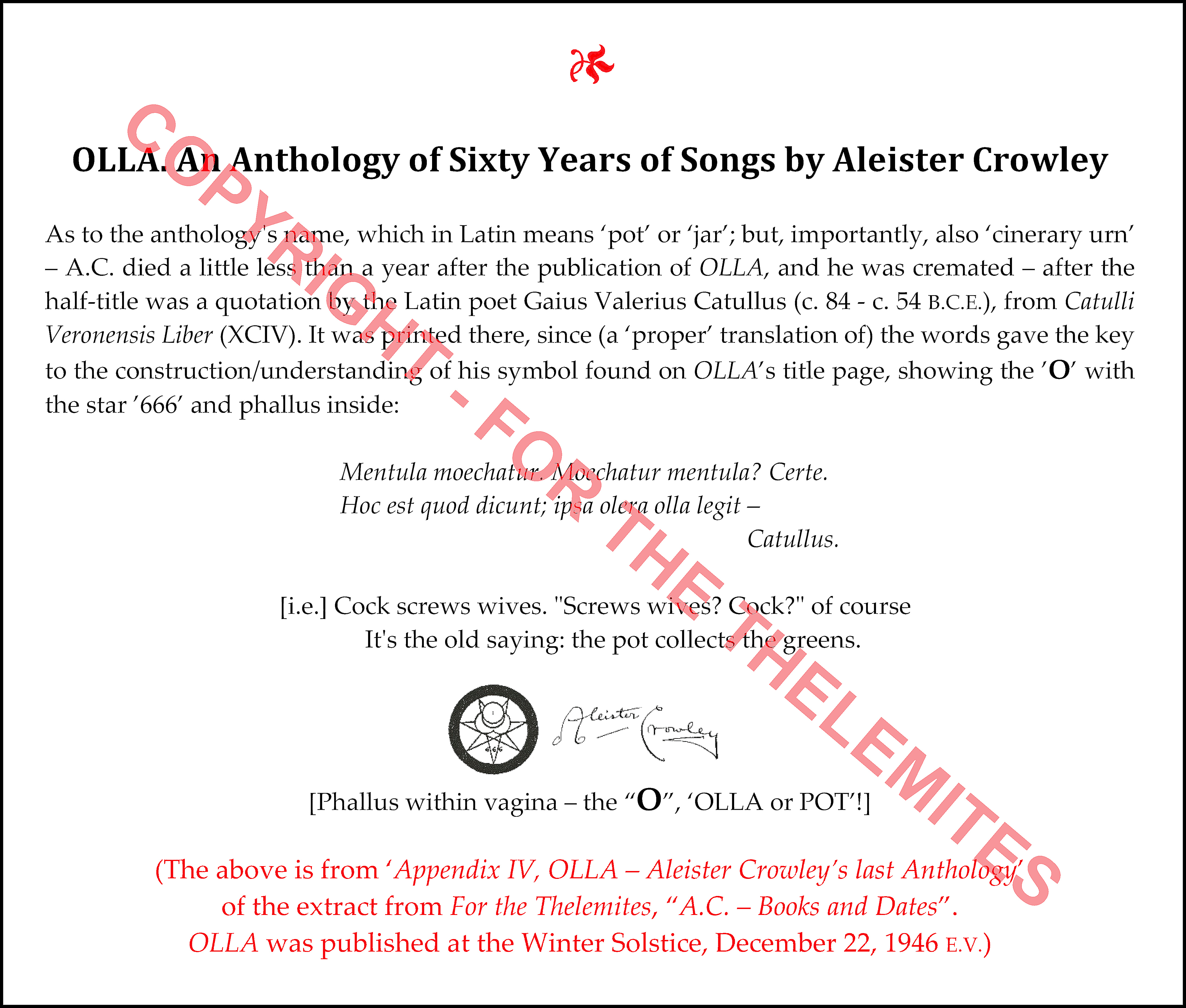 • Aleister Crowley’s last book: OLLA; An Anthology. Sixty Years of Song (London: Published by the O.T.O., An I XX Sol in 0° Capricornus Dec. 22, 10.54 A.M. [1946 E.V.]) Author's collection.