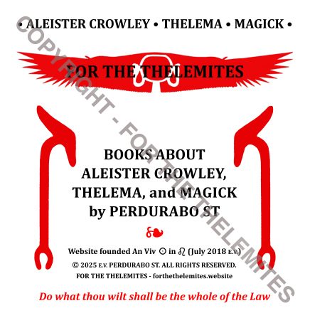 On this website you will find many PDF files/ebooks for free download. Thirty-three secured PDF files/ebooks – most of them illustrated – in total over 1000 pages of various extracts from FOR THE THELEMITES; ROSE AND ALEISTER CROWLEY’S STAY IN EGYPT IN 1904; A STUDY OF THE CAIRO WORKING AND WHAT IT LED TO, together with Liber MCLXX; On Liber L – A Commentary on Liber L vel Legis by Perdurabo ST, for free reading. These extracts contain much new material on many subjects – the outcome of many years of research and magickal work by the author. It is important that you read the “Prelude” of this website, together with the 100-page “Book Preview” of FOR THE THELEMITES on the page “Book Preview”, together with the page “Liber L – The Key”!