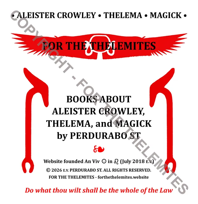 On this website you will find many PDF files/ebooks (256-bit AES) for free download. Thirty-six secured PDF files/ebooks – most of them illustrated – in total over 1150 pages of various extracts from FOR THE THELEMITES; ROSE AND ALEISTER CROWLEY’S STAY IN EGYPT IN 1904; A STUDY OF THE CAIRO WORKING AND WHAT IT LED TO, together with Liber MCLXX; On Liber L – A Commentary on Liber L vel Legis by Perdurabo ST, for free reading. These extracts contain much new material on many subjects – the outcome of many years of research and magickal work by the author. It is important that you read the “Prelude” of this website, together with the 100-page “Book Preview” of FOR THE THELEMITES on the page “Book Preview”, together with the page “Liber L – The Key”!