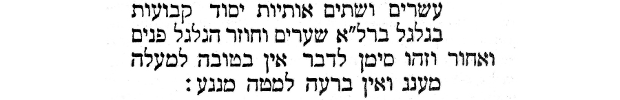 • ‘Twenty-two letters of foundation are set in a circle in 231 Gates. The circle rotates forward and backward. And this is a sign: There is no good higher than delight, and there is no evil lower than plague.’ – Sefer Yetzirah, 2:4.