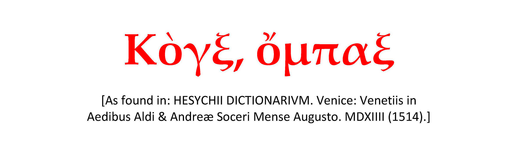 • Johannes Meursius, or, Johan van Meurs (1579-1639), Dutch philologist, and historiographer, who in 1619 mentioned in his book Eleusinia. Sive, de Cereris Eleusinæ sacro, ac festo (The Eleusinia, or Concerning the Holy Rite and Festival of Ceres), that the words ‘Konx Ompax’ were words used at the mysteries of Eleusis – something which he, strangely enough, hinted that he had discovered in the famous lexicon by Hesychius Lexicographus of Alexandria (fl. 5th century A.D.) – However, the surviving MS. of the lexicon known today, which have the words ‘Konx Ompax’, does not mention any ‘mysteries’ or ‘Eleusis’. 'Ioannes Meursius 1614' Author's collection.
