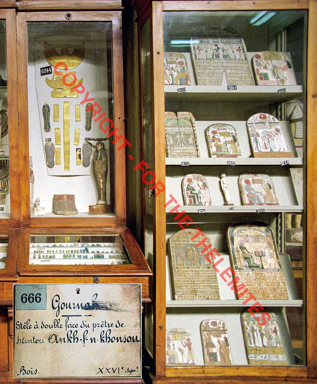 • The funeral stele of Ankh-af-na-khonsu i (died c. 700-675 BCE in the late twenty-fifth Dynasty) exhibited in the Cairo Museum – the museum in which Rose Crowley discovered it in March 1904 E.V.! The front side of the stele is seen to the right on the 2nd shelf from the bottom. Inserted at the bottom of the photo is the old label attached to the stele of Ankh-af-na-khonsu i. In 1904 E.V. the stele was exhibited in the upper floor's ‘Room F’, and here it is seen in its ‘modern’ location in ‘Room 22’ on the upper floor in the end of the 1990s. The stele's current location is the new ‘The Grand Egyptian Museum’ in Giza, where it now is on display. The Museum was officially inaugurated on November 1, 2025 E.V. Author's collection.