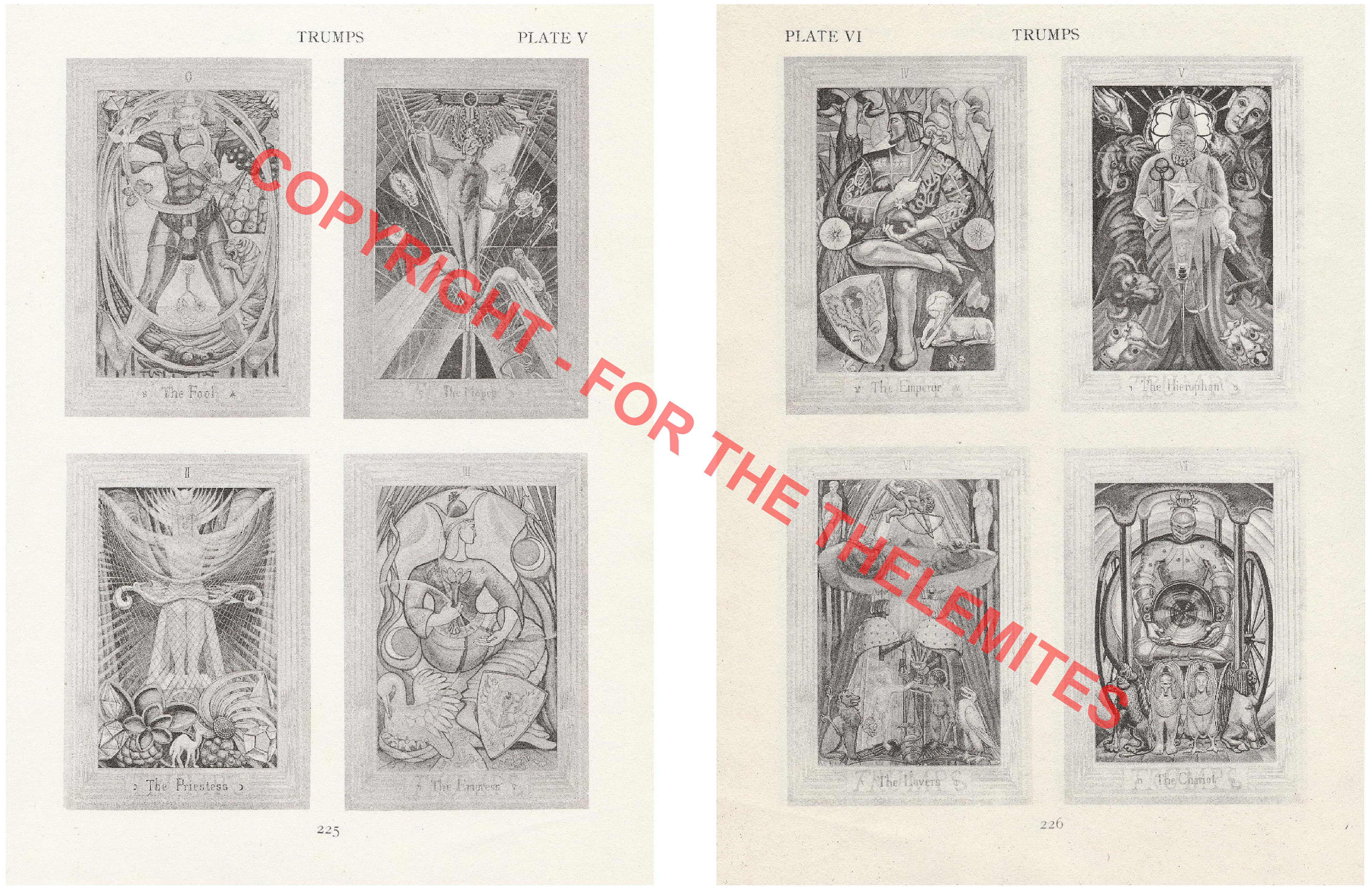 • The first eight Tarot Trumps of the ‘Thoth Tarot deck’ (Plates V and VI), designed by The Master Therion (Aleister Crowley)(1875-1947), and painted by Frieda Harris (1877-1962), which were printed in The Book of Thoth; A Short Essay on the Tarot of the Egyptians, issued 163 years after the publications on the tarot in Monde Primitif, at the Vernal Equinox in 1944 E.V., and published by the O.T.O. at the Chiswick Press in London. The production of the volume (The Equinox, Vol. III, No. V.), thus took place during WWII. Unused page/printed sheet from the publishing project. Author’s collection.